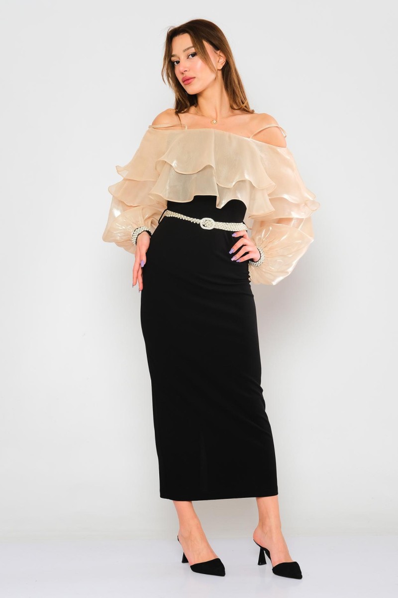 This elegant dress features a scuba crepe body and lightweight sheer chiffon sleeves, offering a modern and refined look. The belt with a metal buckle accentuates the waistline, while the front slit detail adds a feminine touch. Perfect for both special occasions and professional settings.